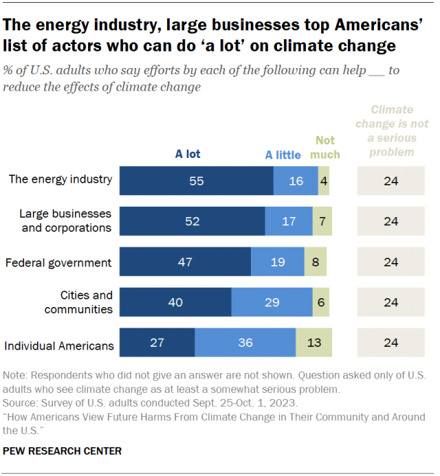 Pew surveyed 8,842 adults in the US between September 25 and October 1, 2023, about their opinions on climate change. The survey asked Americans who said they see climate change as at least a somewhat serious problem which groups they think can do “a lot” to combat climate change. (The deniers who said climate change is not too serious or not a problem – 24% – weren’t asked that particular question.)