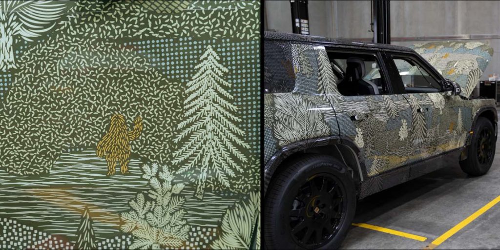 Aside from the Instagram post, Rivian also shared more images of its R2 wraps (seen below) in a blog post that features an interesting Q&A with Szczupak. The Rivian exterior designer explained that inspiration for the design of the wraps came from the outdoors (where else?), in which the team wanted to wrap each production-intent R2 in nature and “have it feel alive, dynamic, and a little mysterious.”